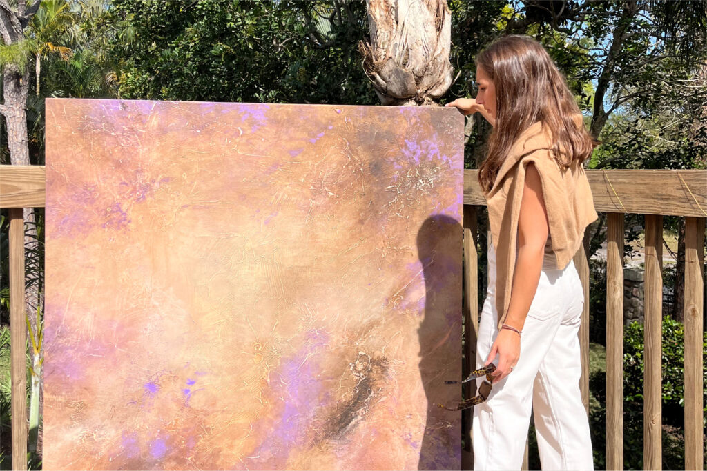 “It represents a deep exploration of her artistic style and creative process. The ‘veils of permanence’ symbolize conceptual layers that gradually overlap to convey her artistic vision. This series plays with tonal values and blurred edges, creating an ethereal sensation complemented by different levels of textures, using the technique of layering to achieve depth and volume, implementing gesso and acrylics on canvas.